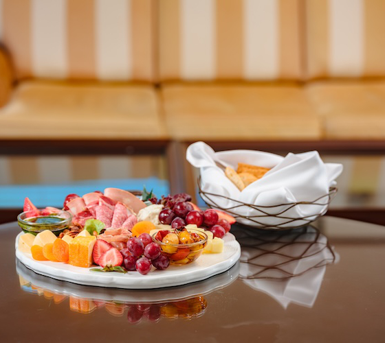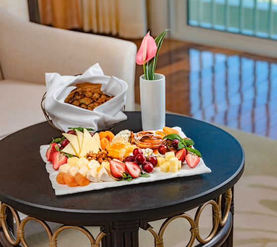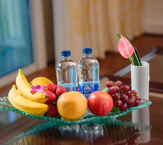 Farmstand exotic fruits, Hawaiian Springs water, assorted international cheese and lavosh choice of Kahala Private Label Chardonnay or Kahala Private Label Cabernet Sauvignon.